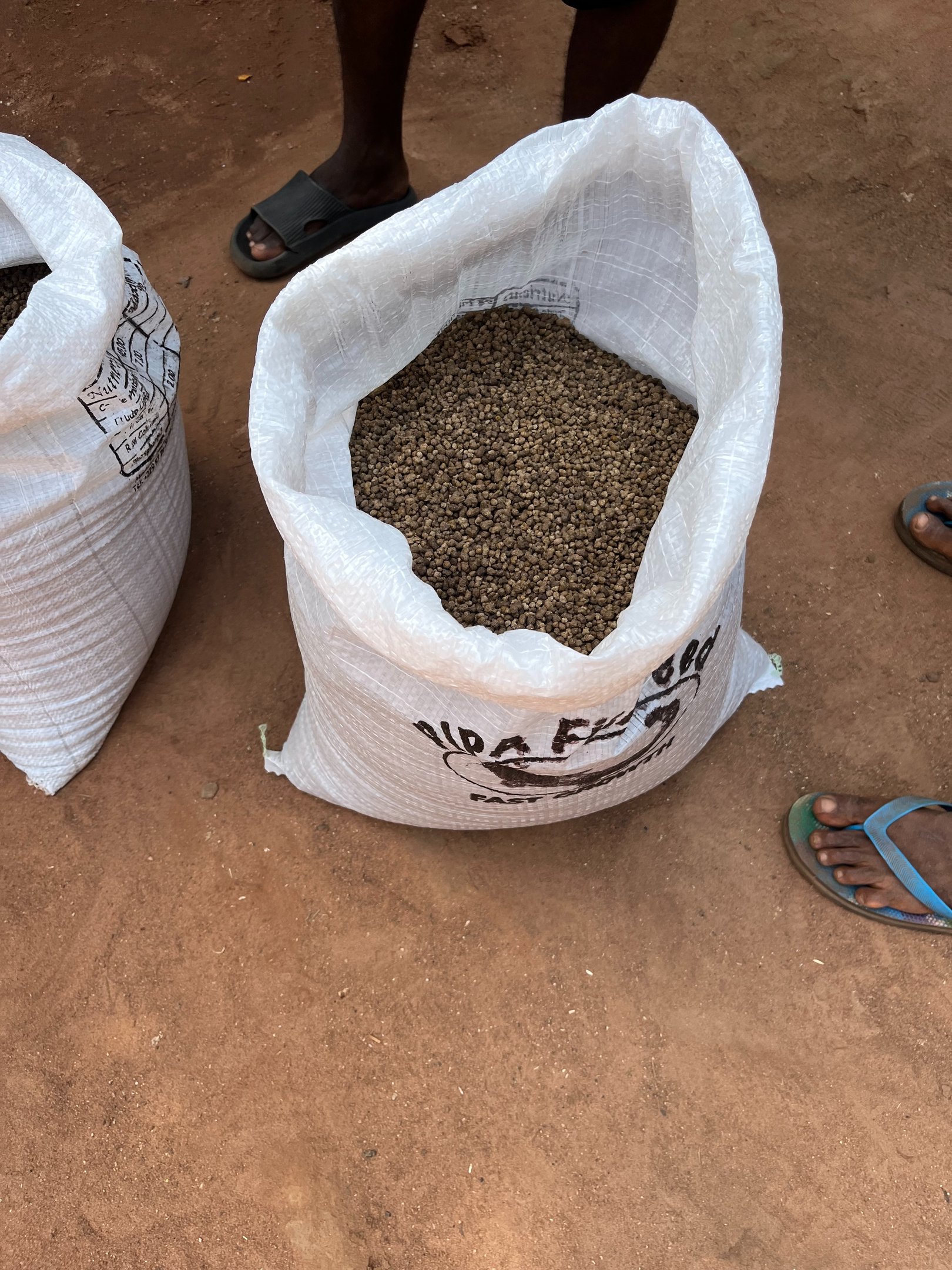 MOBOVOME produces its own pellets for fish, poultry, and rabbits (except for chicks and young fish). These pellets are made from soybean meal, black soldier fly larvae, and corn. The companions manually mix the different ingredients and then form the pellets using an extruder. The pellets are then air-dried, a minimum of 24 hours depending on the sun and humidity.