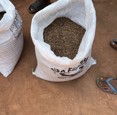 MOBOVOME has a production line for soy oil and soybean meal. The companions manually sort, using sieves, bags of soy bought from a Beninese farm. Then, they roast the soy on the fire, and pass the soy seeds through an industrial press that runs on diesel to extract the oil and produce soybean meal.